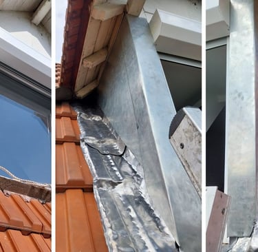 L’intervention a consisté à déposer les éléments défectueux, puis à façonner et poser de nouvelles pièces en zinc, parfaitement ajustées afin d’assurer une protection complète de la fenêtre.